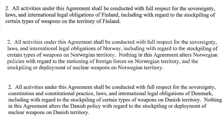 Men den mest brännande punkten under hela debatten är frågan om amerikanska kärnvapen på svensk mark. Såväl Danmark, Norge som Finland har klausuler i sina DCA-avtal syftandes till att värna sin kärnvapenfrihet.