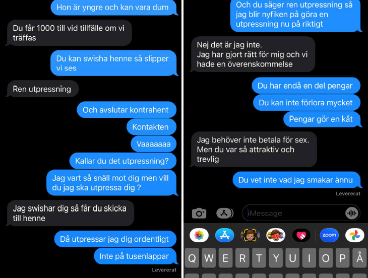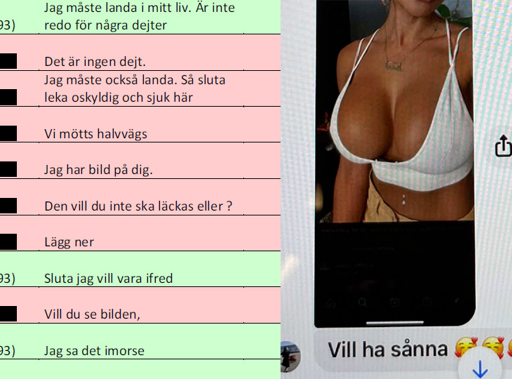 Zainab påminner den moderate politikern om att hon har en bild på honom från när han gav henne oralsex. ”Den vill du inte ska läckas eller ?” skriver hon och pratar om att kontakta pressen.
