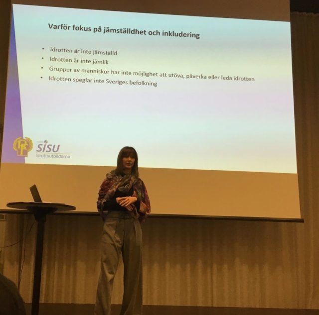 Jenny Svender håller föredrag om jämställdhet och inkludering. Faksimil Facebook
