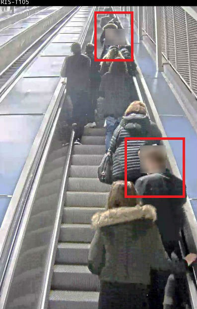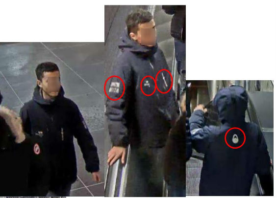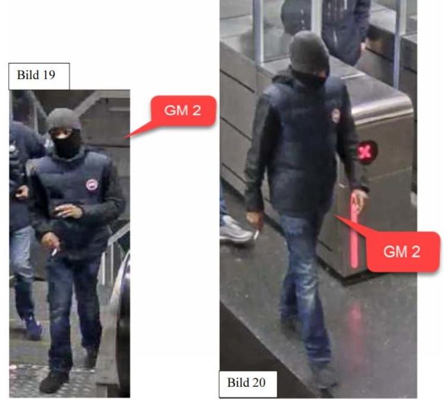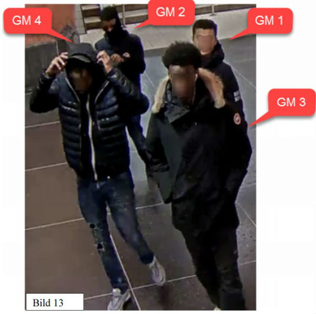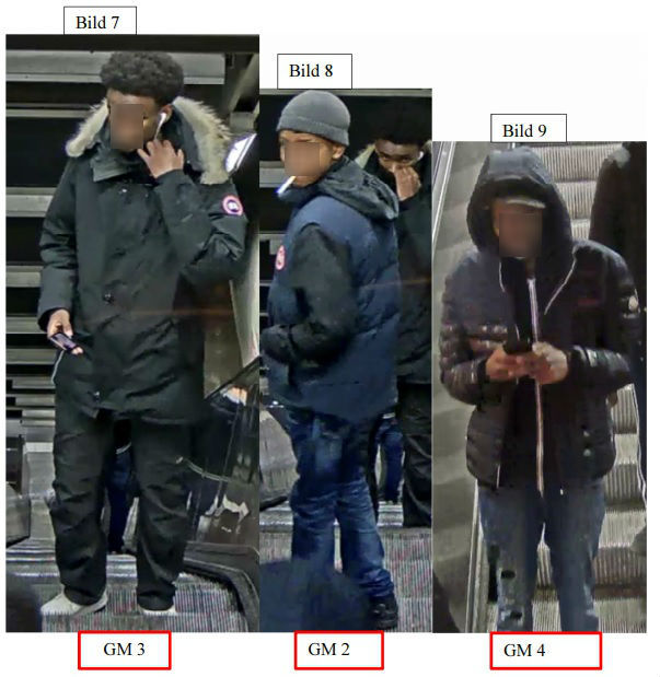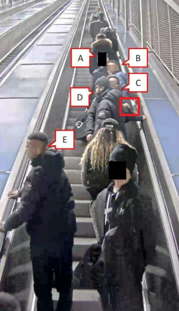 Brottsoffret ser hur gänget iakttar honom under resan och även i rulltrappan upp från tunnelbaneperrongen. I polisförhör uppger han att personerna, som är markerade som B, C, D, och E nedan, deltog i rånet mot honom. Det framgår av polisens bildanalys att person ”C” pekar på brottsoffret.