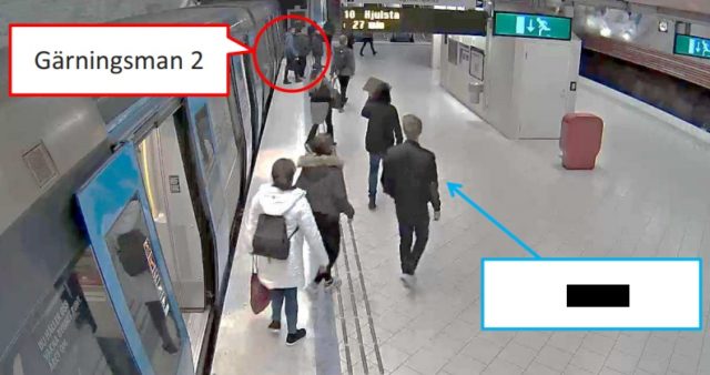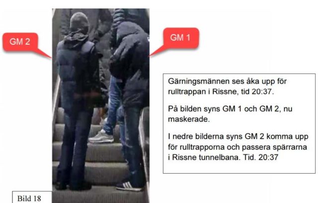 När polisen studerar övervakningskamerorna på den blåa tunnelbanelinjen visar det sig att man känner igen ett gäng som reser från Rinkeby och en station bort till Rissne strax innan personrånet. På bilden syns en av gärningsmännen hålla upp spärrarna för sina vänner för att alla ska kunna resa utan att betala.