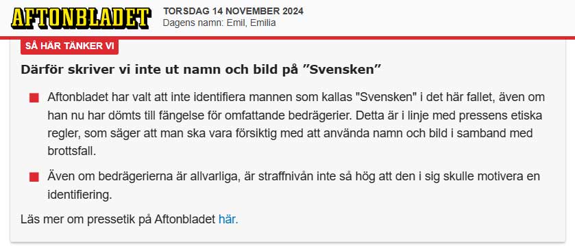 21-årige gängkriminelle Mikail Tuncer med invandrarbakgrund från Turkiet har i den undre världen fått smeknamnet ”Svensken”. Under lång tid har han försörjt sig på att lura svenska åldringar på deras pengar – det handlar om miljonbelopp. Nu döms han till fängelse i sin utevaro – han är nämligen försvunnen och tros befinna sig i Turkiet. Då påföljden för de allvarliga brotten med rasistiska inslag blir mild, anser vänsterlutande Aftonbladet att det är god pressetik att skydda Mikails personliga integritet genom att inte publicera hans namn och bild.