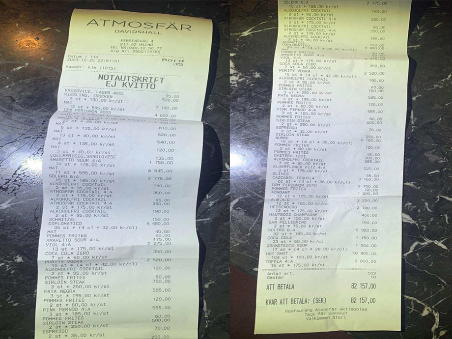 Det är på juldagen ifjol som ett sällskap på ett 30-tal personer bokat bord på restaurang Atmosfär i Malmö. Sällskapet, som innehåller både vuxna och barn, äter och dricker för stora summor pengar – drygt 82 000 kronor.