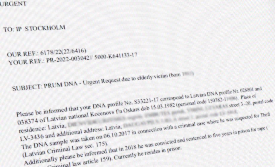 I mars 2022 hör plötsligt polisen i Lettland av sig till sina kolleger i Sverige. Det DNA som säkrats från gärningsmannen efter våldtäkten 2017 har matchats till en dömd lettisk medborgare i 40-årsåldern som sitter bakom lås och bom i Lettland.