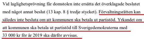 Men några pengar blir det av allt att döma i dagsläget ändå inte. Förvaltningsrätten avslår nämligen SD:s begäran med förklaringen att de inte kan besluta att en kommun ska betala ut partistöd.