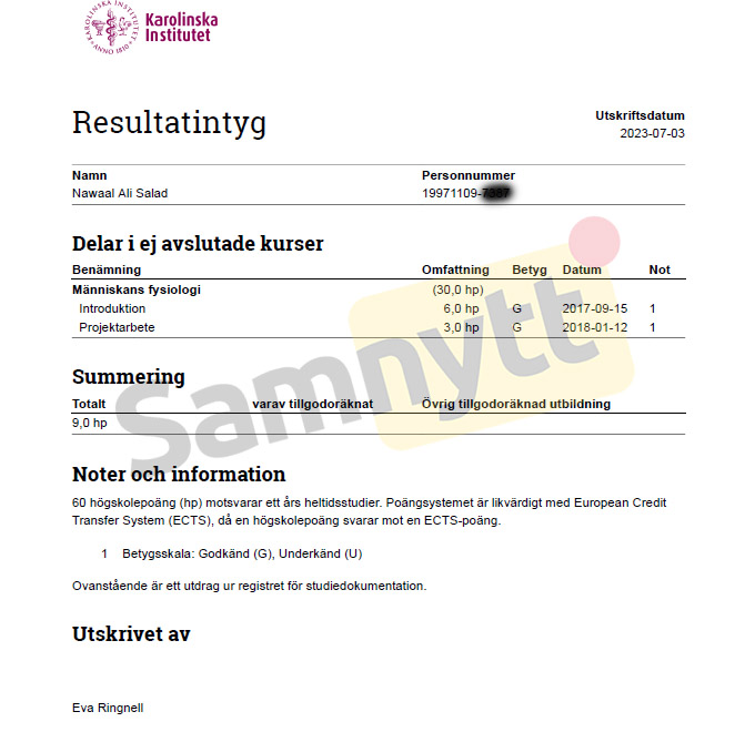 Den namnteckning som finns på den falska läkarexamen tillhör Maryam Tasdigh. Hon arbetade tidigare som examens- och antagningshandläggare på Karolinska institutet, men hade i januari i år avslutat den tjänsten.