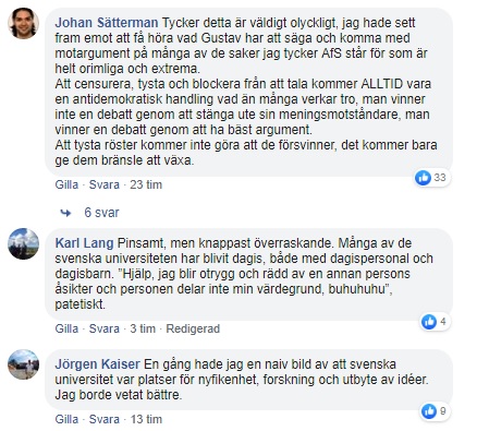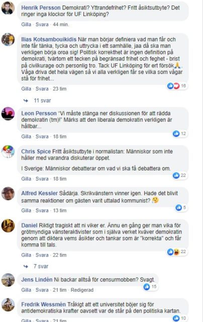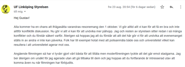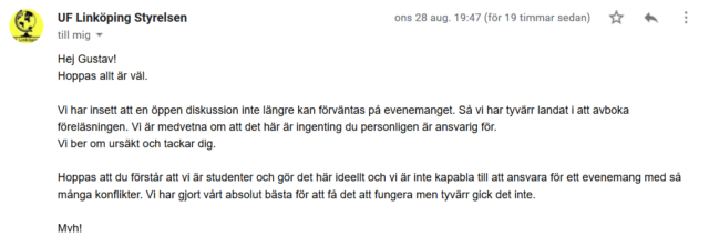 Ett par dagar senare blir påtryckningarna för mycket för UF Linköping som väljer att vika sig för hoten om polisanmälan och avboka partiledaren.
