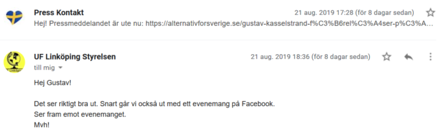 Samhällsnytt har tagit del av mejlkonversationen mellan UF Linköping och Kasselstrand där det framgår att föreningen ser fram emot evenemanget.