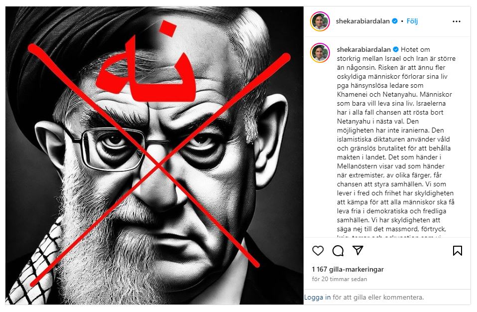 Det är på Instagram och Facebook som Shekarabi lagt upp bilden där en folkvald premiärminister likställs med en islamistdiktator som tillträdde sin post 1989. I den ackompanjerande texten skriver socialdemokraten att hotet om ett krig mellan Israel och Iran är större än någonsin och att det beror på ”hänsynslösa ledare som Khamenei och Netanyahu”.