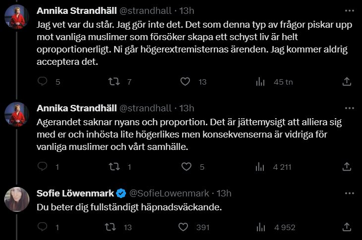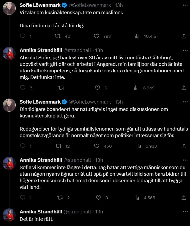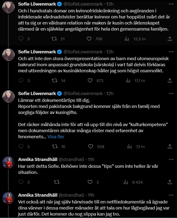 På X hånade Annika Strandhäll regeringens och Sverigedemokraternas ambitioner för att bekämpa den flora av problem som omgärdar kusinäktenskap men fick direkt mothugg av Sofie Löwenmark, journalist på sajten Doku som granskar islamism i Sverige och internationellt samt expert på hedersförtryck.
