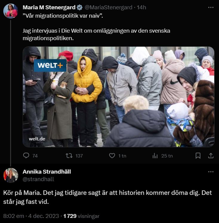 Det är i ett svar till ett inlägg på X, tidigare Twitter, som Annika Strandhäll går till attack mot migrationsministern. Maria Malmer Stenergard länkar i sitt inlägg till en intervju med tysk media i vilken hon bland annat konstaterar att den svenska invandringspolitiken varit naiv och berättar om hur man tillsammans med Sverigedemokraterna nu lägger om denna.