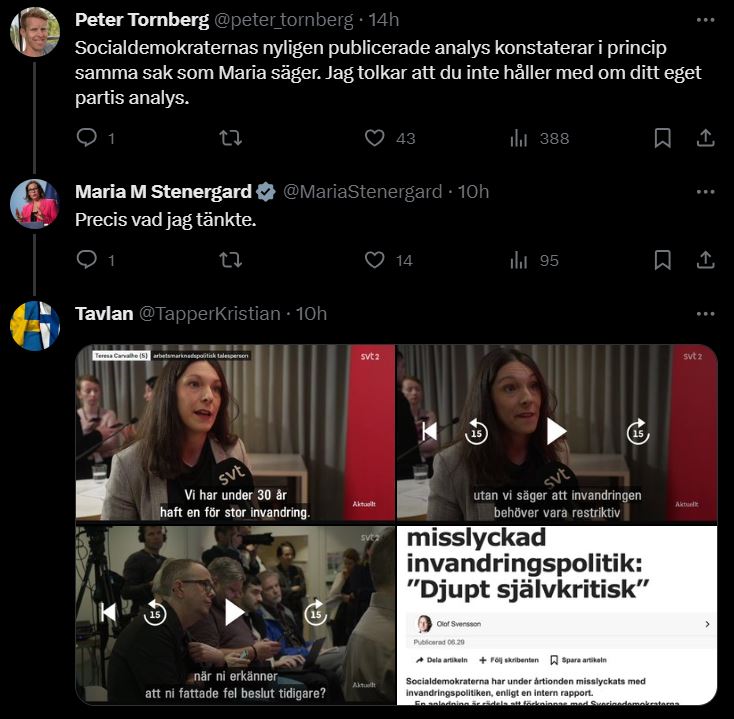 Bara några dagar efter att Socialdemokraterna gett ut en rapport i vilken man nu påstår sig inse att man bedrivit helt fel slags invandringspolitik under decennier, delvis som ett motstånd till Sverigedemokraterna, går före detta miljö- och klimatminister Annika Strandhäll (S) till attack mot migrationsminister Maria Malmer Stenergard (M) för Tidöpartiernas arbete med att städa upp i migrationshaveriet.