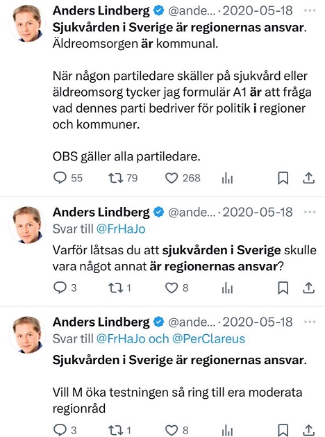 Då Sverige hade en socialdemokratiskt ledd regering 2020 lät det dock annorlunda – då hävdade Aftonbladets politiska chefredaktör Anders Lindberg med emfas att sjukvårdens ekonomi i stället är regionernas ansvar, vilket i ljuset av attacken mot Ulf Kristersson kan te sig en smula motsägelsefullt.