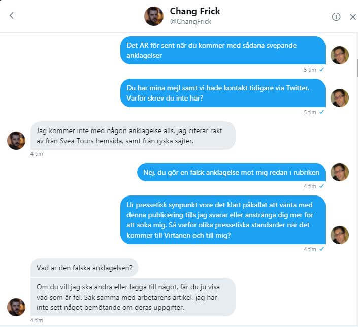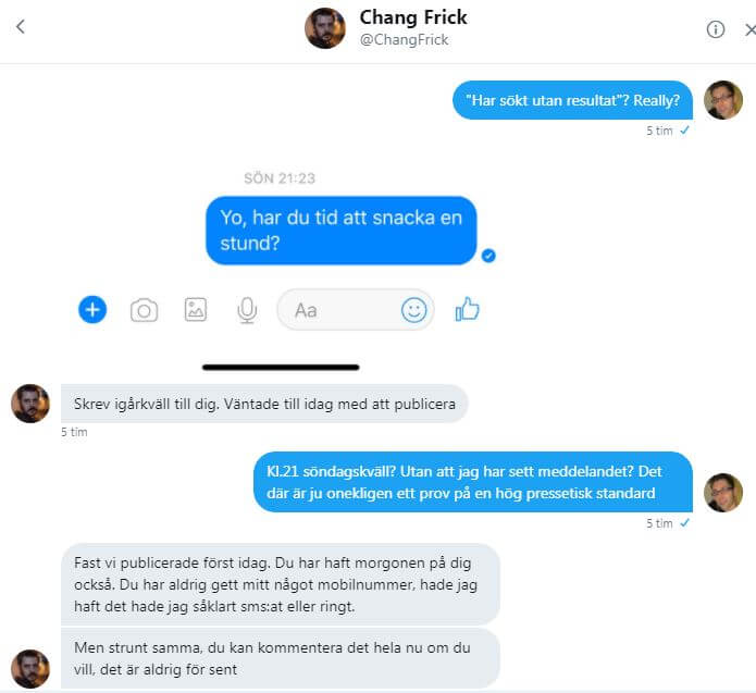 Artikeln i Nyheter Idag publicerades imorse trots att Frick inte hade någon kommentar från mig – och tydligen inte ville ha det heller. När jag konfronterade honom med detta förklarade han sig med att han skrev till mig på Facebook – kl.21.23 i söndags kväll. Trots att hans meddelande inte har lästs av mig i Facebook-chatten – vilket går att se – valde han att publicera sin artikel med grova anklagelser mot mig.
