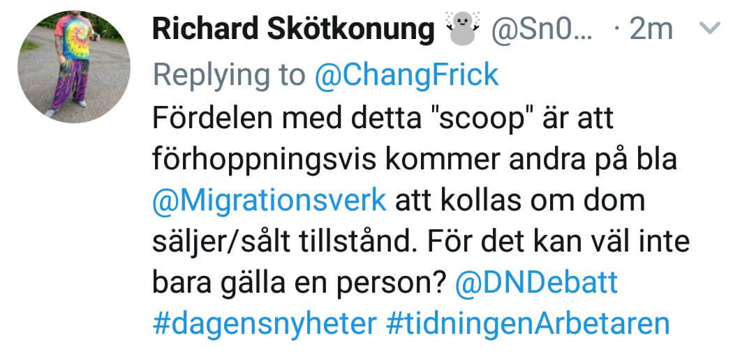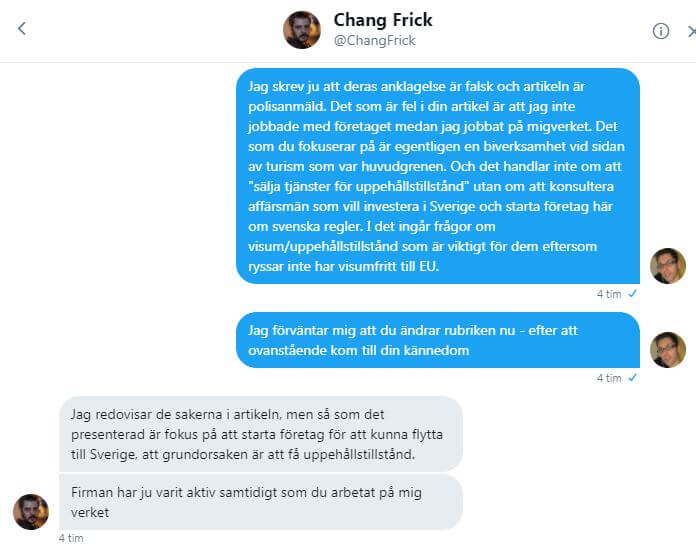 Det som Frick samtidigt utelämnar är att den skärmdump som illustrerar artikeln och ska inge en känsla av trovärdighet för det hela är tagen ur ett inlägg från februari 2011 – långt innan jag fick en tjänst på Migrationsverket. Det som han inte heller fokuserar på är att företagets huvudverksamhet var turismresor för de tusentals ryskspråkiga turister som besökte Sverige varje år.