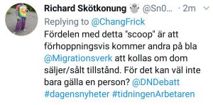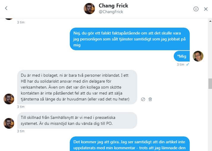 Frick försökte varken kontakta mig på mejl eller på Twitter – detta trots att vi tidigare haft kontakt där. Men även när jag kontaktade honom på egen hand dröjde det flera timmar tills han kompletterade artikeln med en av mina kommentarer.
