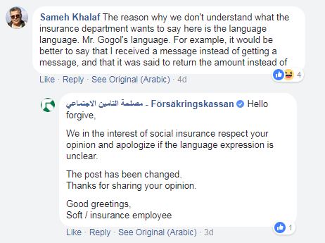 I kommentarsfältet hånas Försäkringskassan samtidigt för dålig arabiska – någonting som myndigheten ber om ursäkt för och lovar en förbättring i ett svar: