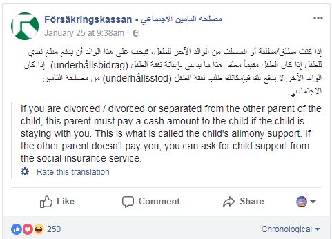 Jag har faktiskt er grupp på arabiska framför mig just nu. Och ett inlägg som postades så sent som för två veckor sedan handlar just om att informera om att det finns möjlighet att söka bidrag för underhållsstöd…
