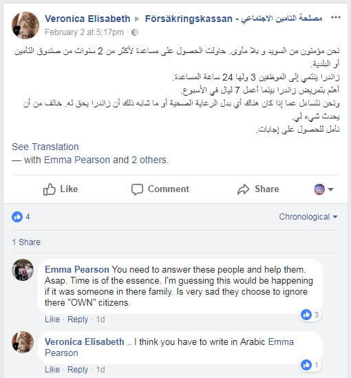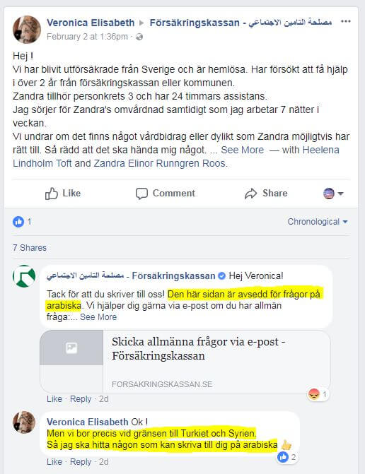 Men trots att Försäkringskassan svarar på sådana frågor snabbt och uttömmande verkar svenskar i behov av hjälp inte få samma bemötande: Veronicas inlägg låg obesvarat sedan i fredags tills lunchtiden idag – detta trots att nyare inlägg på arabiska redan besvarats av myndigheten. Inlägget fick ett formellt svar först efter att Samhällsnytt kontaktat Försäkringskassan med frågor om fallet.
