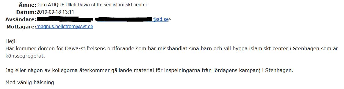 Samma kväll åker samma reporter, som nu alltså har belägg för påståendena, ut till Stenhagen igen – för att intervjua just Attique Ullah, ordföranden i Dawastiftelsen, som han just fått en dom om. Men trots att det föreföll vara en ypperlig möjlighet att ställa frågor kring domen samt mannens syn på andra religioner under intervjun, lyser de frågorna med sin frånvaro. Istället får ordföranden utan några motfrågor hävda att ”hela samhället oavsett religion” ska vara välkommet i det nya islamistiska centret – trots att domen om barnmisshandel med religiös bakgrund vittnar om någonting helt annat.