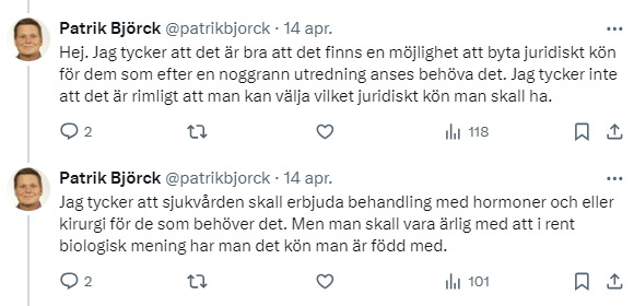 ”Jag tycker att det är bra att det finns en möjlighet att byta juridiskt kön för dem som efter en noggrann utredning anses behöva det. Jag tycker inte att det är rimligt att man kan välja vilket juridiskt kön man skall ha”, resonerade han på det sociala mediet X i söndags.
