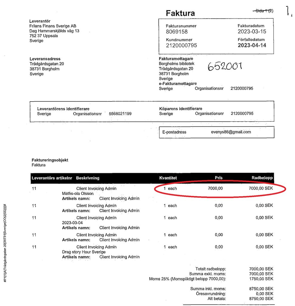 Det framgår av fakturor att debiterar 7 000 kronor för två sagostunder om 30 minuter.