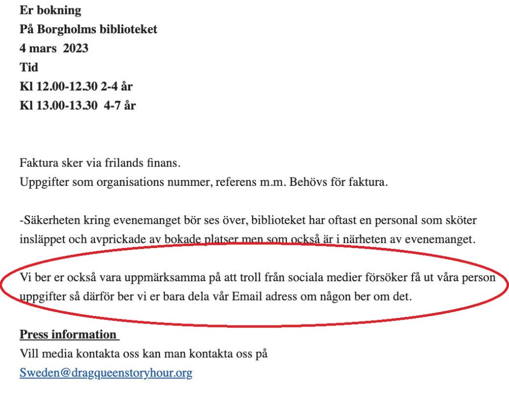 Den initiala kontakten togs av Drag Story Hour, som skickade mejl till biblioteket i november."När vi läser ger vi barnen positiva queera förebilder som utmanar könsnormerna". pic.twitter.com/mt5r8DXXGs— Gustav Kasselstrand (AFS) ???????? (@gustavkassel) May 15, 2023