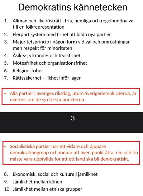 Eleverna har fått läsa att ”alla partier i Sveriges riksdag, utom Sverigedemokraterna, är överens om de sju första punkterna” som listas i presentationen som kännetecknande för demokrati.