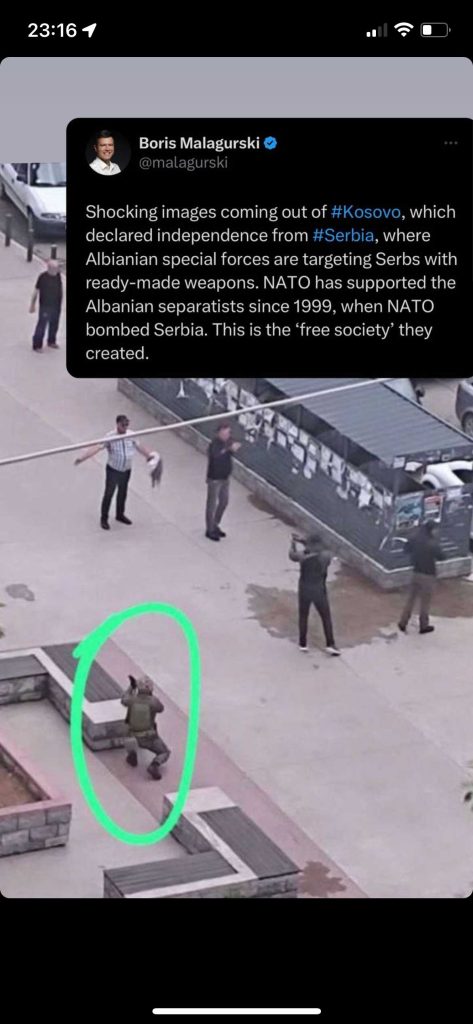 I samma veva har Sverige gått med i den så kallade fredsalliansen men som hittills endast använt våld för att lösa konflikten. Vidare benämner Artikel 5 i Natos stadga de ömsesidiga försvarsgarantierna som i princip tvingar Sverige att gå in med sina trupper i Kosovo om ett krig skulle utbryta. Det är svårt att inte se en sammanhängande röd tråd om man lägger samman pusselbitarna: Demonstrationer i Belgrad som utbryter efter två skolskjutningar har beräknats vara större än innan Milosevics fall. Samtidigt gör Kosovos specialstyrkor våldsamma försök att överta de resterande serbiska myndighetsbyggnaderna i Norra Kosovo och möts då med demonstrationer av civila serber.