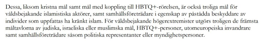 Det framgår av rapporten att muslimer kan komma att slå till mål kopplat till kriget mellan Israel och Hamas. Men annars är det främst hot mot de som ska ha kränkt islam, politiker som skyddar islamkritiker, kristna mål och HBTQ+-rörelsen.