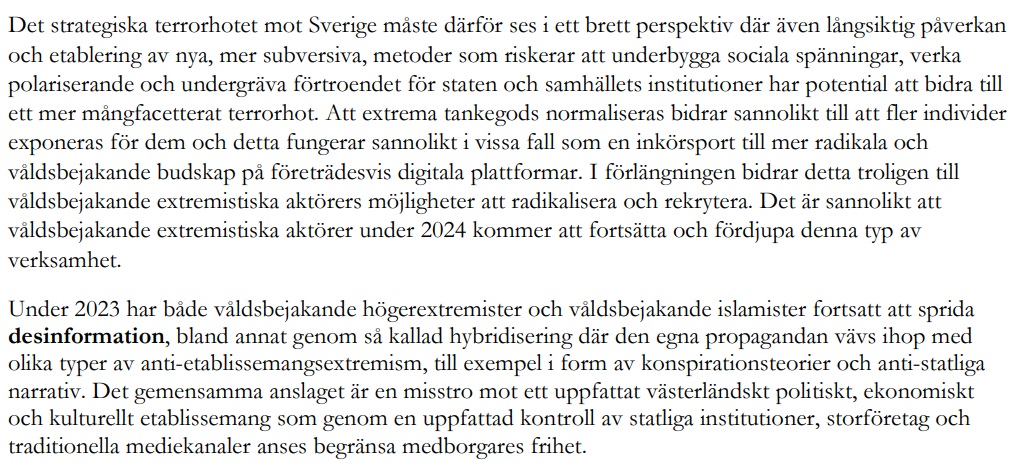 Det framförs att det strategiska terrorhotet mot Sverige även måste ses i ett bredare och författningshotande perspektiv när det gäller islamism och högerextremism.