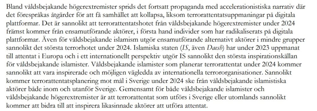 Enligt Säpo och NCT kommer de främsta attentatshoten mot Sverige under 2024 sannolikt från aktörer som agerar utifrån våldsbejakande islamism och våldsbejakande högerextremism.