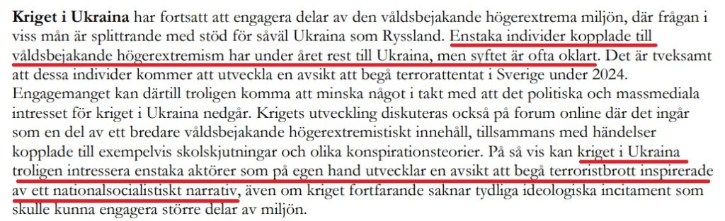 I rapporten nämns även det pågående Ukraina-kriget. Enligt myndigheterna har flera personer kopplade till våldsbejakande högerextremism i Sverige rest till Ukraina under det föregående året.