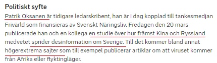 I artikeln hos statstelevisionen medverkar även den profilerade debattören Patrik Oksanen som nyligen publicerat rapporten som heter ’Informationspandemi – desinformation i skuggan coronakrisen’ genom tankesmedjan Fri Värld som finansieras av Svenskt Näringsliv.