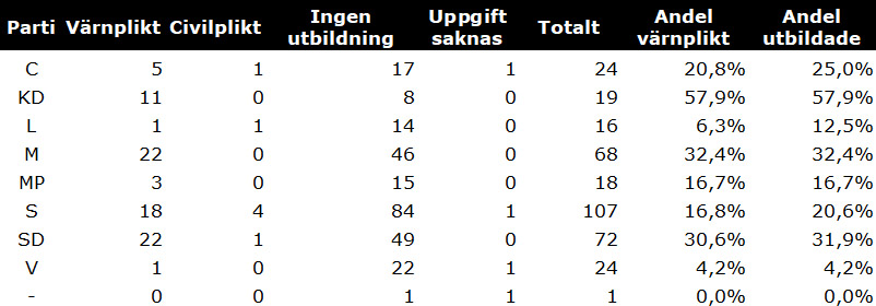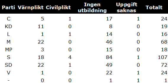 Räknat på ett genomsnitt för samtliga partier så har 23,8 procent av ledamöterna, 83 stycken, genomfört värnplikten. Därutöver har sju genomfört civilplikt.