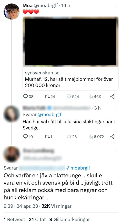 I sociala medier är det dock inte alla som uppskattar den majblommesäljande asylsökaren. När Moa Berglöf, tidigare politiskt sakkunnig hos och talskrivare åt statsminister Fredrik Reinfeldt (M), uppmärksammar artikeln är det flera som svarar med nedsättande kommentarer om den driftige 12-åringen.