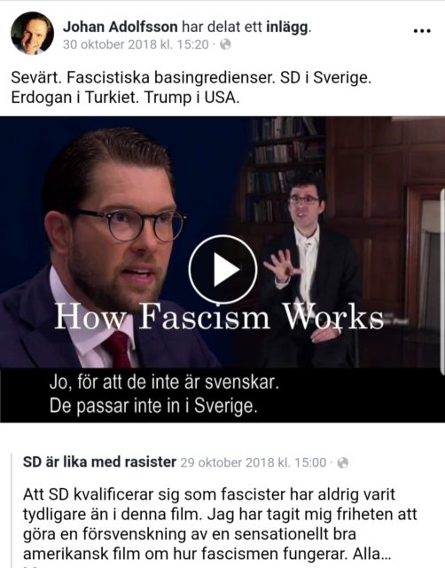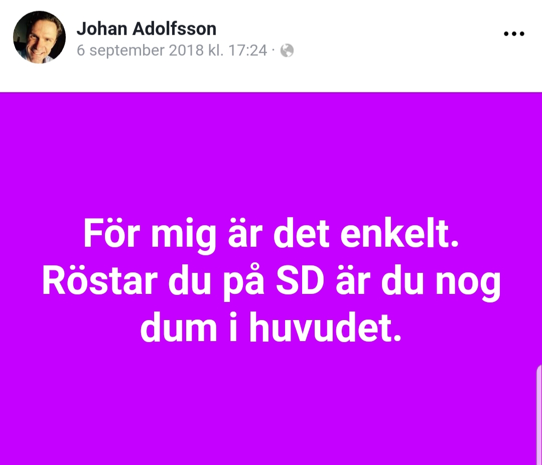 I ett tidigare svar har du nämnt att vi piskar upp hat eller hatisk stämning. Jag vill återkoppla till det och citera ett inlägg som du har skrivit på din offentliga Facebook den 6 september 2018. Jag citerar: ”För mig är det enkelt – röstar du på SD är du nog dum i huvudet”. Är inte det hat?