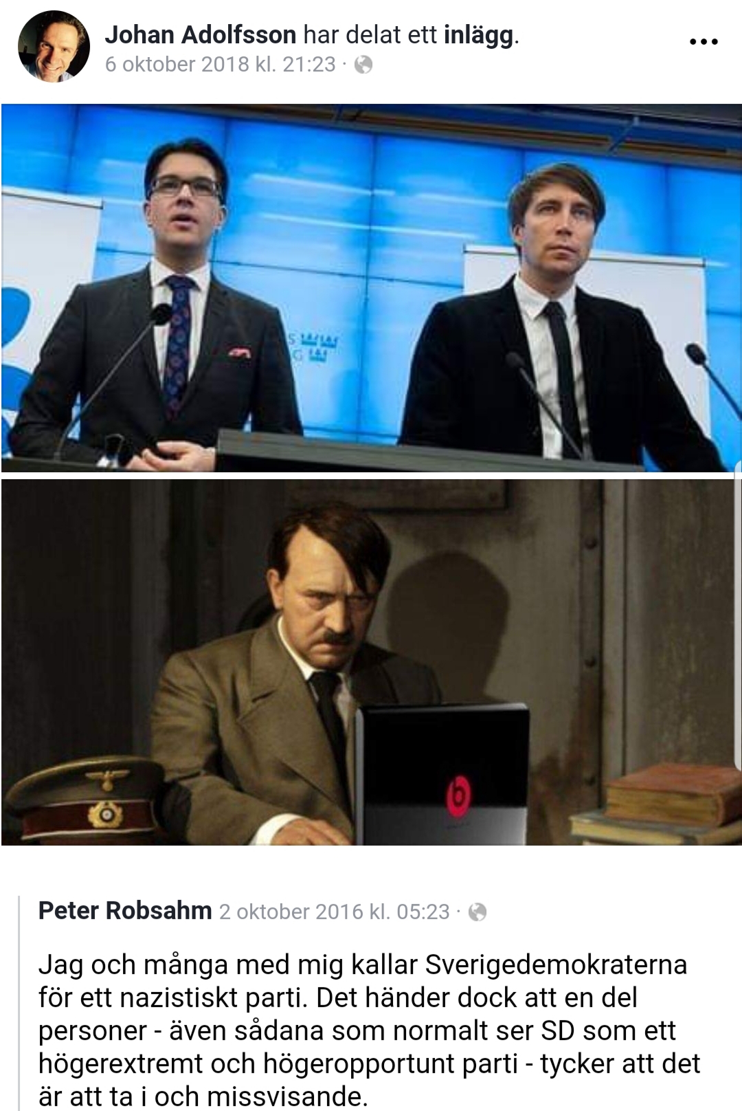 – (paus) Det är din åsikt. Du försöker nu att tolka min upplevelse. Det är nästan genant för dig. Bara sluta med det… Nu är det så här. Du får skriva vad du vill. Er trovärdighet och det ni sysslar med är ju bara trams… Det vet vi. Ni försöker att ge er på mig och vad jag publicerat på min facebook. Lycka till! Om du har frågor om min lämplighet då vänder du dig till min chef Helén Åleskog och då kommer hon att säga: ”Jag har fullt förtroende för Johan Adolfsson”. Samtalet är nu slut!
