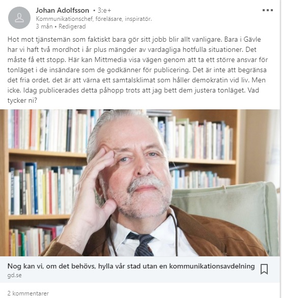 – Sådana diskussioner har vi dagligen med insändarredaktionen… Så ser det ut… Så här ser relationen ut mellan alla våra… mellan kommunen och våra ansvariga utgivare. Sådana diskussioner har vi hela tiden. Och det är ingenting som är konstigt med det. Om vi upplever att någon är hotfull eller förolämpar till exempel, då säger vi det och frågar: ”Vill ni verkligen att det står så eller vill ni gå ut med en ren felaktighet?” Så ser normal presshantering ut. Inget märkligt med det.