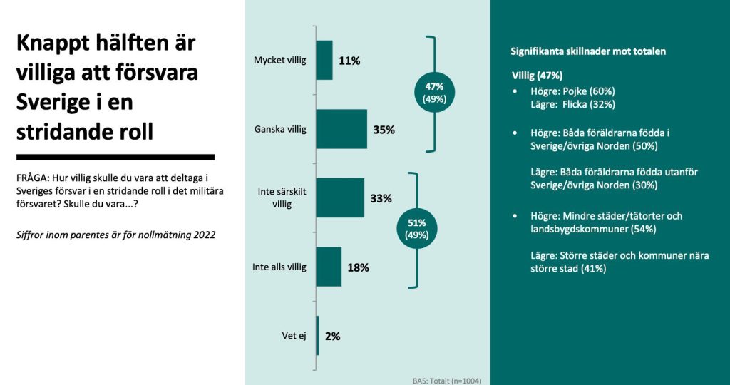 53 procent villiga att ställa upp i försvaret i krig är en något sjunkande andel jämfört med de senaste åren, men enligt Sten Widmalm, professor vid Uppsala universitet, är det en relativt hög siffra jämfört med andra europeiska länder.