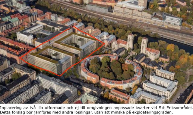 I Stockholm har de styrande – Allianspartierna plus MP – i samarbete med fastighetsägaren Locum och Tengbom arkitekter AB presenterat ett förslag till nybyggnation. Planen är att verksamheten vid S:t Eriks ögonsjukhus flyttas till Nya Karolinska och istället byggs bostäder, kontor och verksamhetslokaler. Men det modernistiska bygget utmanas nu av Sverigedemokraterna, som lanserar ett helt annorlunda förslag.