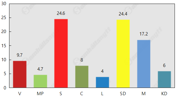 I senaste opinionsundersökningen får nu SD mer stöd än M och KD tillsammans. Med 24,4 procent av rösterna hamnar SD strax under Socialdemokraterna som får 24,6 procent.