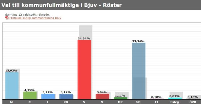Vid sidan om Bromölla, Hörby, Svalöv och Sölvesborg tar SD från och med årsskiftet även över styret i skånska Bjuv. I samband med valet förra året ökade SD med över 20 procent i Bjuv samtidigt som Socialdemokraterna tappade kraftigt vilket nu visar sig ge resultat.