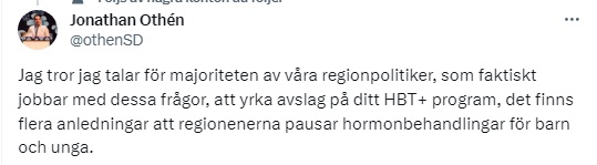Jag föreslår i mitt HBT+program till SD landsdagar i höst att vuxna transsexuella ska ges ett snabbspår så att, vuxna människor snabbt kan få vård, samtidigt som barn ges möjligheten att utredas noggrannare för att undvika permanent ånger i framtiden.
