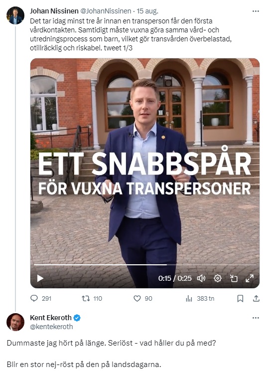 Sverigedemokraternas EU-parlamentariker Johan Nissinen föreslog nyligen ett ”snabbspår för vuxna transpersoner i vården”. Efter utspelet fick han hård kritik från partikamrater och försvarade sig då med att ”många har hört av sig och sagt att det här är ett av de bästa förslagen de har hört.” Men trots stödet från väljare drar han nu tillbaka förslaget.