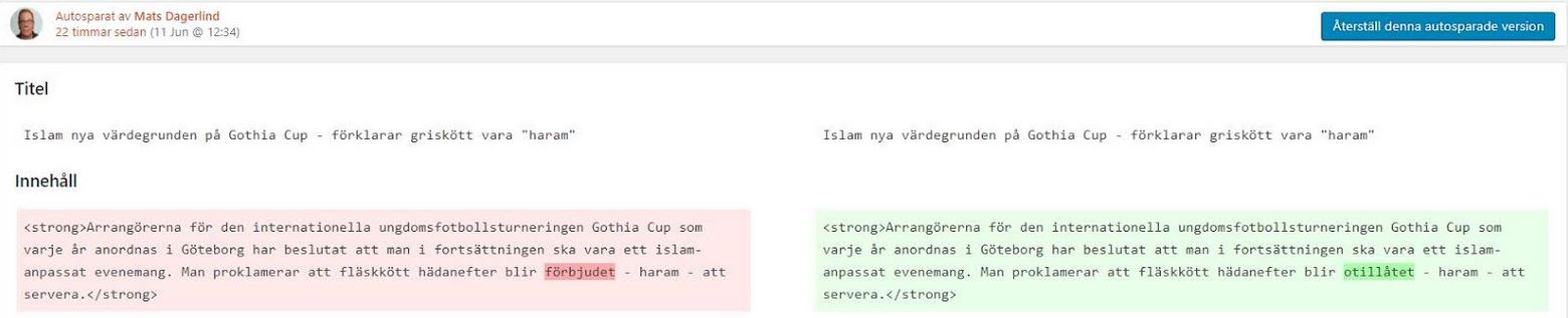 Tidningen redovisar dock inte vilka ord som har bytts i vår artikel trots att uppgiften skulle kunna visa att någonting i artikeln inte stämmer. Och det finns en anledning till det: det enda som ändrats är att ordet ”förbjudet” har bytts mot synonyma ”otillåtet”. Här ser ni vad som bytts ut exakt i en skärmdump från artikelns ändringslogg:
