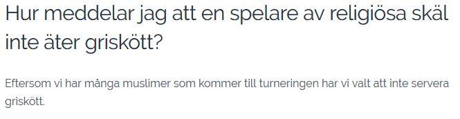 Beslutet är som synes fattat med hänsyn till islam och dess påbud om att fläskkött är ”haram”, dvs fog finns för att hävda att turneringen har anpassat sig till islams värdegrund. Rönnefors har i intervjuer med andra medier vidgått att beslutet är relaterat till det stora antalet muslimer på evenemanget.