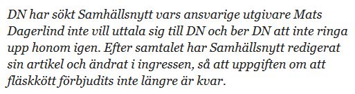 Det enskilt mest anmärkningsvärda uppgiften i DN:s artikel är ett påstående om att Samhällsnytt skulle ha redigerat den aktuella artikelns ingress i efterhand ”så att uppgiften om att fläskkött förbjudits inte längre är kvar”: