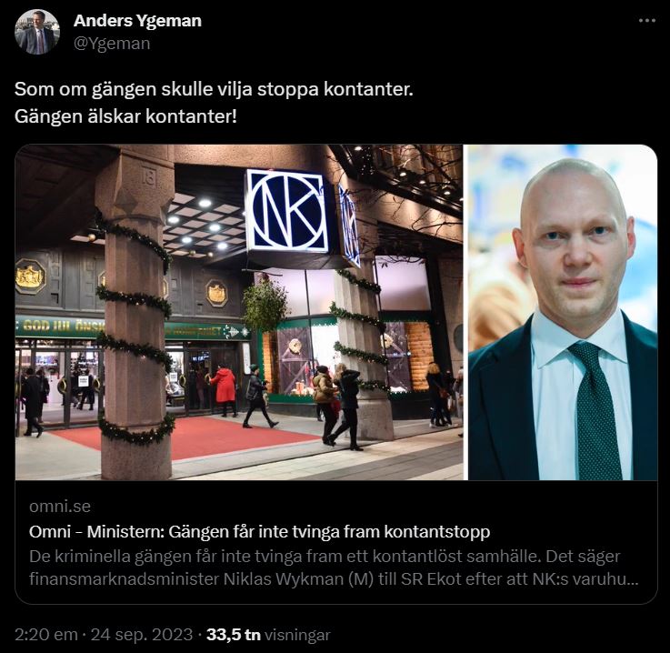 Detta är något som finansmarknadsminister Niklas Wykman (M) har reagerat på. Han anser att samhället inte ska bli kontantfritt på gängens villkor, och han tror inte heller att kontantfria butiker kommer få en särskilt stor effekt på gängkriminella.