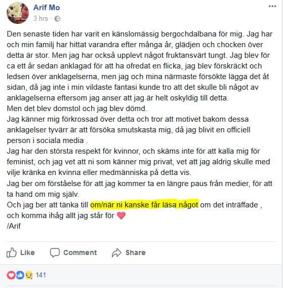 Efter Samhällsnytts avslöjande igår om att de ”ensamkommandes” talesperson Arif Moradi är dömd för sexualbrott mot en 14-årig flicka skrev han ett inlägg på sitt numera stängda Facebook-konto. I inlägget kallar han sig feminist, beklagar sig över domen och antyder att anklagelserna mot honom är falska.